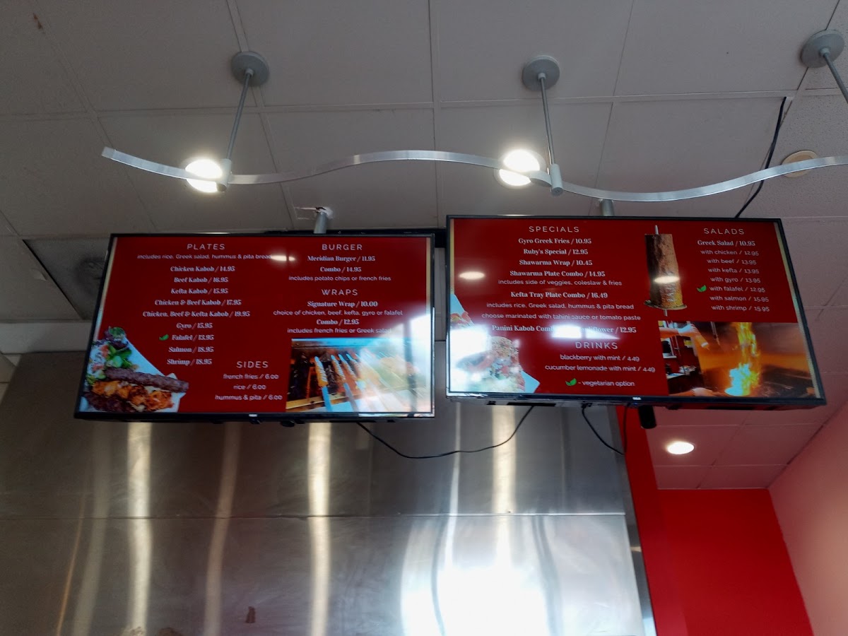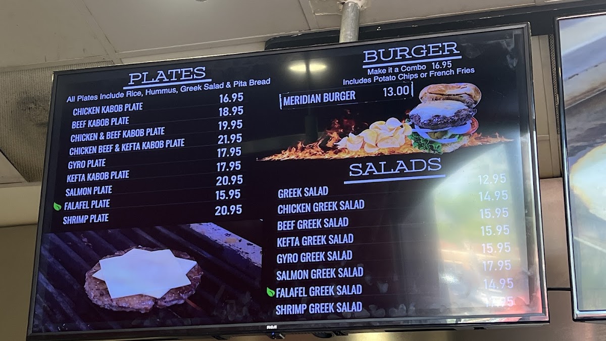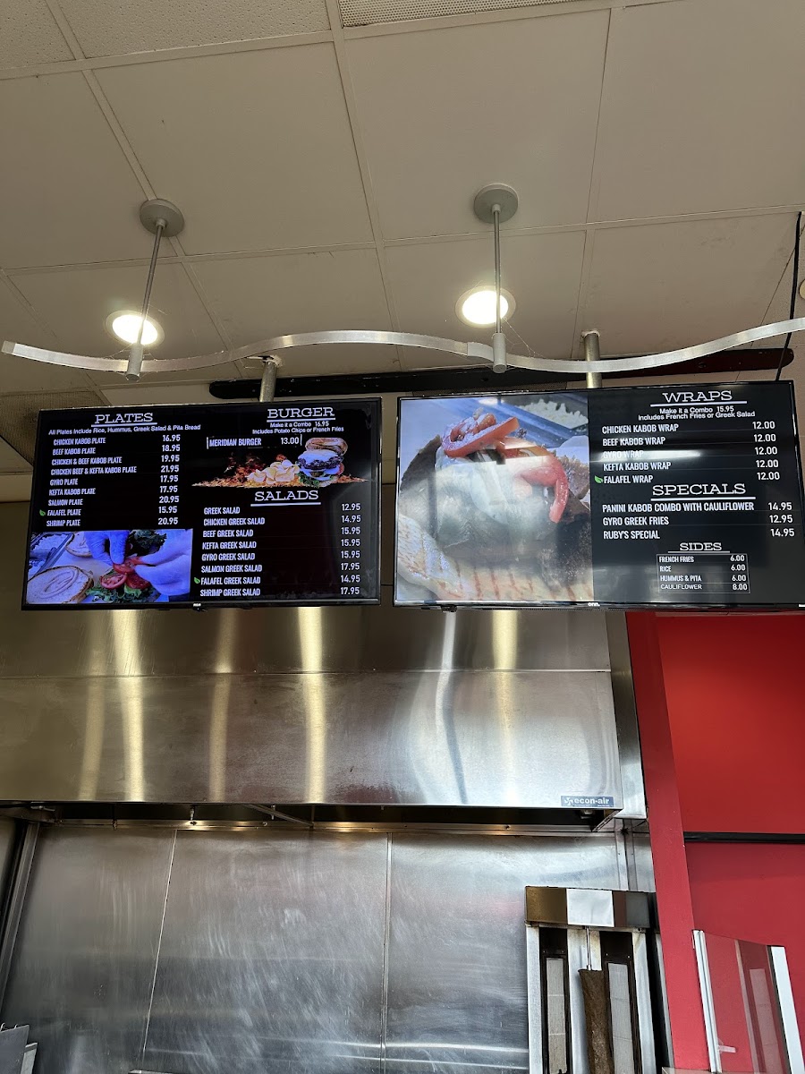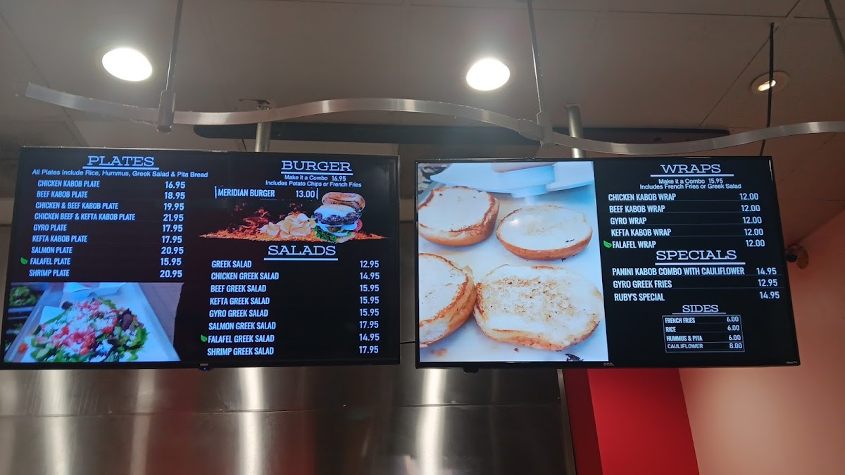 The menu at Hummus Bean offers a diverse selection that caters to both traditional Mediterranean tastes and hearty, modern cravings. The salads, including Greek Salad, Chicken Greek Salad, Beef Greek Salad, Kefta Greek Salad, and Gyro Greek Salad, provide fresh, vibrant options for lighter fare. For those seeking a more filling meal, the plates such as Chicken Kabob Plate, Beef Kabob Plate, Chicken and Beef Kabob Plate, Chicken, Beef and Kefta Kabob Plate, and Gyro Plate showcase a range of well-seasoned proteins. The pita wraps, including Chicken Kabob, Beef Kabob, Gyro, Kefta, and Falafel, are perfect for a convenient handheld option. Specials like Ruby's Special, Gyro Greek Fries, and the Panini Kabob Combo with Cauliflower add unique twists that highlight the restaurant’s creativity. Burgers are represented by the Meridian Burger, offering a fusion-style choice for burger enthusiasts. Complementing the main dishes are sides such as French Fries, Rice, Hummus & Pita, and Cauliflower, while desserts like Baklava provide a sweet finish. Overall, the menu strikes a balance between traditional Mediterranean dishes and inventive specials, making it versatile for a range of tastes and appetites.